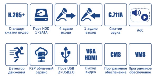 До 4 каналов аудио: 4 канала RCA или до 4 каналов AoC. AoC (Audio over Coaxial) - позволяет передавать аудиосигнал по коаксиальному кабелю вместе с видеосигналом без необходимости подключения отдельного микрофонного кабеля. Видеорегистратор имеет функцию облачного сервиса P2P, которая позволяет, при наличии интернет соединения, получить доступ к просмотру видеоизображения и настройкам видеорегистратора из любой точки мира с помощью компьютера, планшета или смартфона. Программное обеспечение AMATEK CMS, VMS позволяет объединить несколько цифровых регистраторов (до 500 видеовходов) в единую сеть.