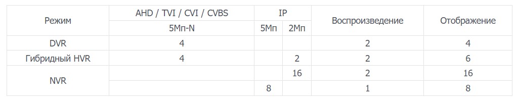 NVR режим (IP-камеры): 8 каналов 5Мп, 16 каналов 2Мп (1080P)