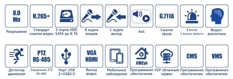 Гибридный 16-ти канальный 8Мп Н.265+ видеорегистратор с поддержкой аналоговых AHD, TVI, CVI, XVi, CVBS (960H) и IP камер. Аудио: 6 каналов RCA или до 16 каналов AoC. AoC (Audio over Coaxial) - позволяет передавать аудиосигнал по коаксиальному кабелю вместе с видеосигналом без необходимости подключения отдельного микрофонного кабеля.