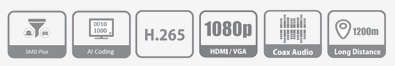 4-канальный HDCVI-видеорегистратор c SMD. Формат видеосигнала: HDCVI, AHD, TVI, IP, CVBS. Отображение: до 1080p; запись: до 1080N25к/с; кодирование: AI-Coding, H.265+, H.265, H.264+, H.264. IP-каналы: до 5 каналов до 6Мп. Накопители: 1 SATA III до 6Тбайт. Видеоаналитика: 4кн интеллектуальный детектор движения SMD Plus, интеллектуальный поиск, 1 HDMI, 1 VGA; сеть: 1 RJ45 100Мбит/с. Аудиовх/вых: 1/1. Питание: 12В(DC).