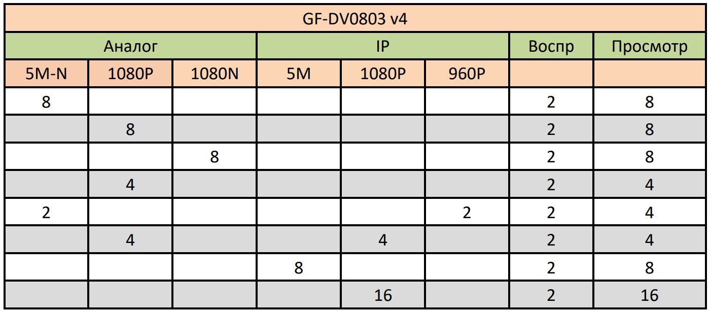 GF-DV0803 v4 имеет Аудио входы/выходы - 1 / 1 и входы/выходы Тревога – 0 / 0.