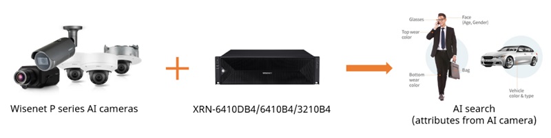 XRN-6410DB4 / 6410B4 / 3210DB4 поддержка поиска AI особенности при использовании с серии WISENET P камер AI . Пользователи могут искать различные атрибуты с камер AI, такие как люди (пол, возраст, шляпа, сумка, цвет одежды) и транспортное средство (тип, цвет).