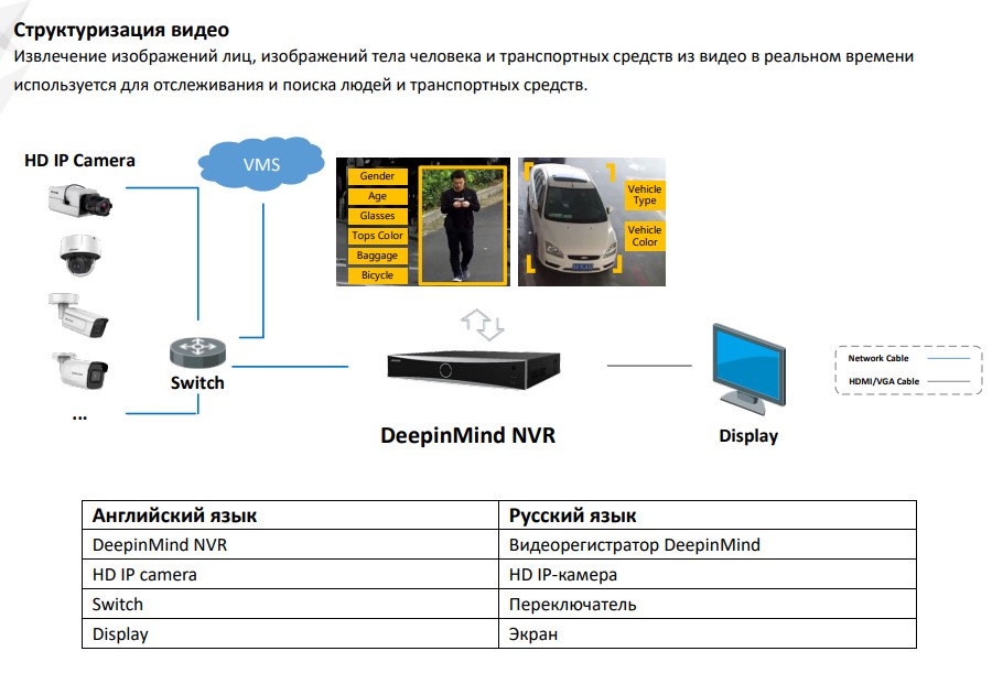 Аналитика структуризации Анализ структуризации видео в реальном времени: до 8 каналов, 2 Мп (HD IP-камера, до 8 Мп, H.264/H.265)