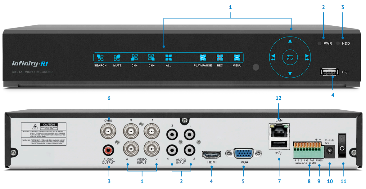 • 4 видеовхода BNC, видеовыходы HDMI, VGA и BNC, 4 входа аудио и 1 выход, 4 тревожных входа и 1 выход, RS485, 2 порта USB