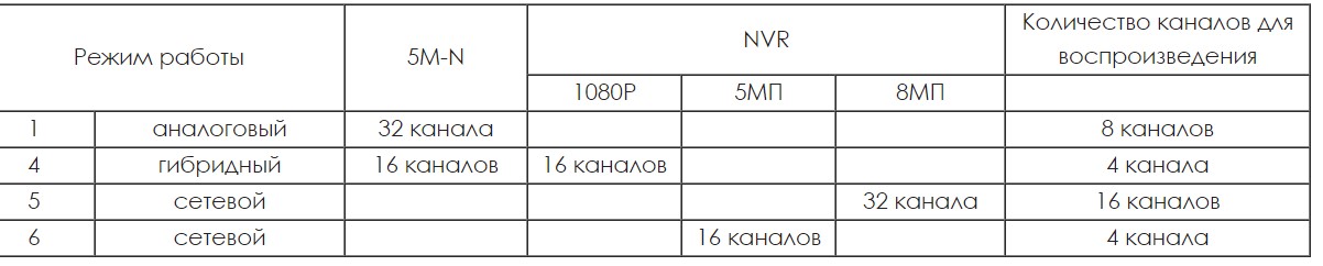 Аналоговый режим: 32 камеры 5M-N AHD/TVI/CVI/XVI / CVBS