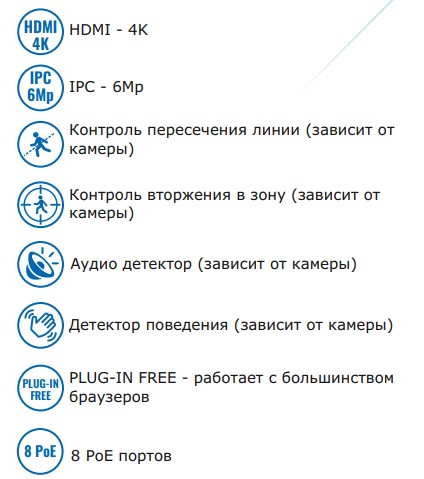 Цифровой видеорегистратор режим работы: 10 IP (6Mp). Всего видеовыходов: 1 (HDMI), HDMI 3840x2160, 1920×1080, 1440x900,1366x768,1280x800,1280x720,1024x768. Поддерживаемые видеокодеки: S+265/H.265/H.264. Поддерживаемые аудиокодеки: G.711A / G.711U / ADPCM_D / AAC_LC. Запись IP камеры (разрешение / скорость): до 6Mp (25 к/с (зависит от камеры)). 1 SATA 3.0 до 8Тб. Сетевой интерфейс: RJ-45 10/100 Mbps. P2P: VideoSight. Поддержка платформ: Android/Iphone/Windows (PC). Напряжение питания/ потребляемая мощность (без HDD): 48В / 90Вт. Рабочая температура: -10°C ~ +55°C. Габариты, мм.: 200 х 199,5 х 42,5 мм.