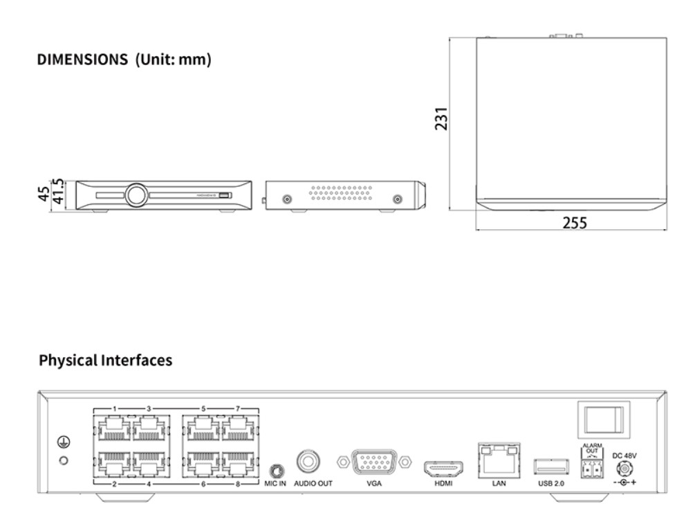 • Порт PoE: 8×RJ45 самоадаптивные сетевые интерфейсы 10/100 Мбит/с